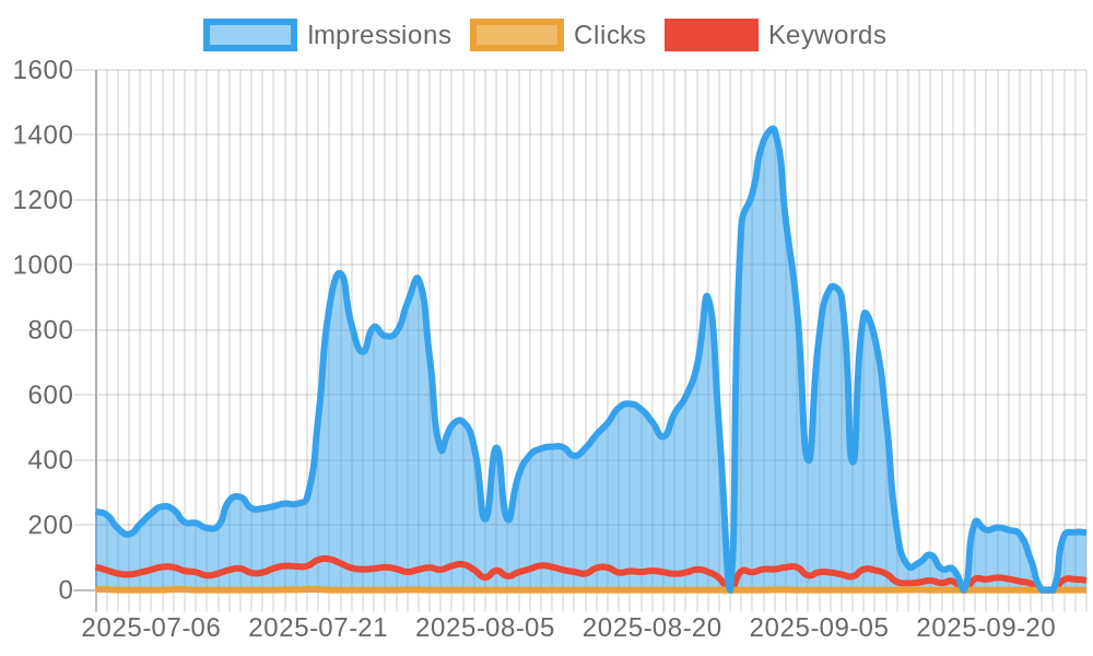 Your website showed up in 41k searches covering 4.8k different keywords. It received 20 clicks resulting in a CTR of 0.05 %. The graphic shows the distribution over the last 90 days.