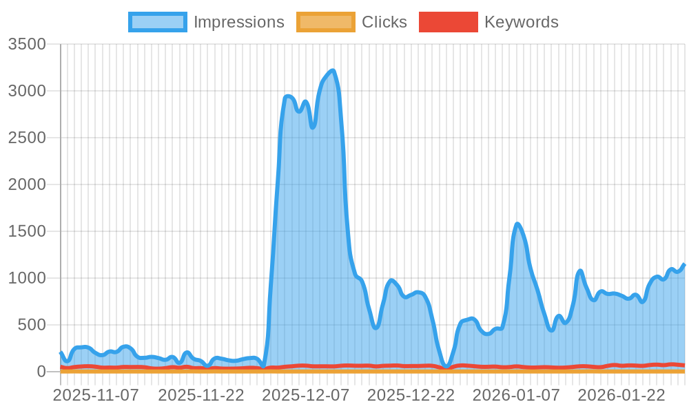 Your website showed up in 72k searches covering 4.5k different keywords. It received 7 clicks resulting in a CTR of 0.01 %. The graphic shows the distribution over the last 90 days.